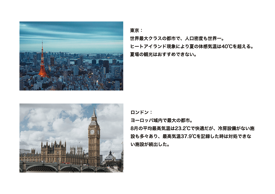 グループ化されていない例では、写真の上にそれぞれの都市名を書く必要があり、下の説明でもまた都市名が出てくるため無駄があります。また、これは情報量が少ないためグループ化されていない情報でもある程度は見やすくなっていますが、通常の情報量が多い媒体に組み込むと非常に読み難くなります。
